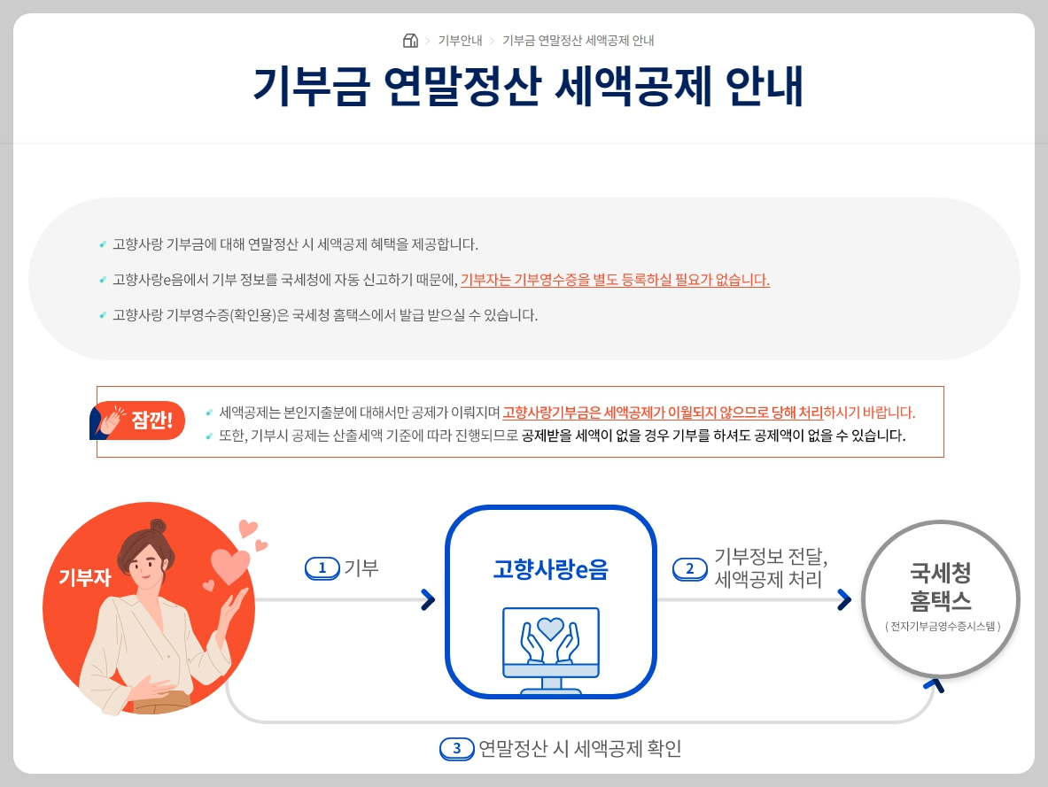 기부 후에는 영수증을 보관해 연말정산에 활용하세요. 전자 영수증은 국세청 홈택스에서 발급받아 안전하게 관리할 수 있습니다.