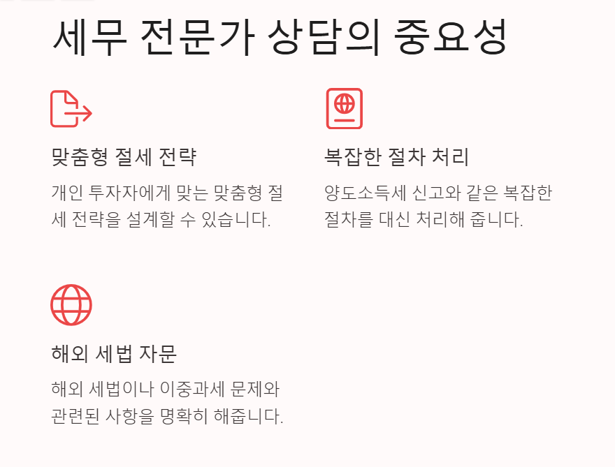세무 전문가는 양도소득세 신고와 같은 복잡한 절차를 대신 처리해 줄 뿐만 아니라, 해외 세법이나 이중과세 문제와 관련된 사항도 명확히 해 줄 수 있습니다. 정기적으로 세금 상담을 받으면 최신 법규에 따른 절세 기회를 놓치지 않을 수 있습니다.