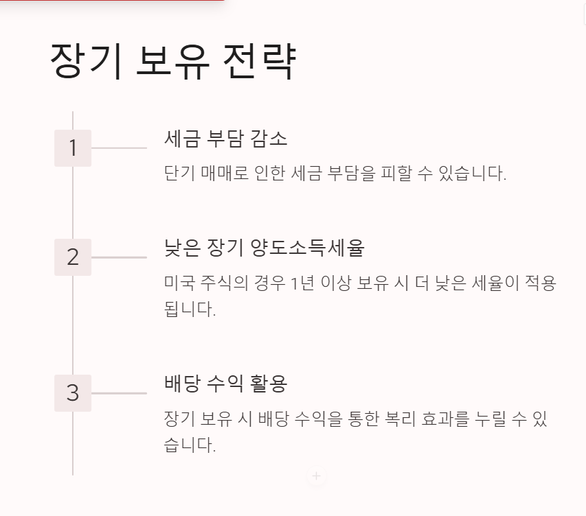장기 보유는 세금 부담을 줄이고 자산 안정성을 높이는 투자 방법 중 하나입니다. 단기 매매로 인해 발생하는 세금 부담을 피하기 위해서는 주식을 장기적으로 보유하는 것이 유리합니다. 특히 미국 주식의 경우, 1년 이상 보유한 경우에 더 낮은 세율의 장기 양도소득세율이 적용됩니다.